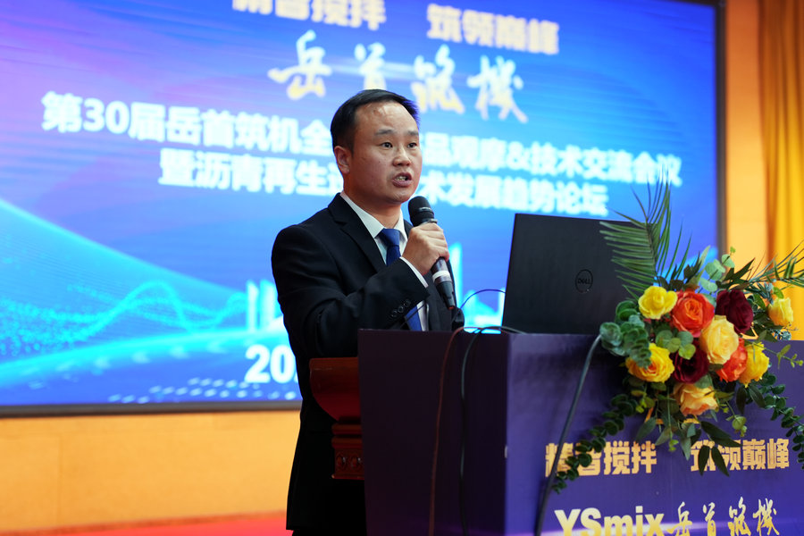 在技术论坛环节,行业顶尖专家与岳首技术团队带来了一场高规格的学术盛宴。焦生杰教授以《沥青搅拌设备高质量再生技术发展趋势》为题,深入剖析了沥青再生技术的行业现状与未来方向,为行业技术升级指明路径;张西农秘书长发布的《行业数据分析报告》,用详实数据勾勒出工程搅拌装备行业的发展脉络与市场机遇。岳首筑机技术团队则依次带来专项技术分享:王兆明高级工程师详解《基于5G远程智能控制的逆流式沥青原生再生一体机搅拌设备及系列沥青设备》,展现岳首在5G智能控制与沥青再生领域的创新成果;王伟高级工程师介绍的《新一代智控柔性阶梯快换式稳定土厂拌设备》,凸显了设备模块化、智能化的升级亮点;宁方良、刘斌、成华勇等技术专家还分别从混凝土搅拌设备差异化创新、建筑垃圾破碎与骨料整形设备融合、搅拌站控制系统解决方案等维度,分享了岳首的技术实践与行业思考。