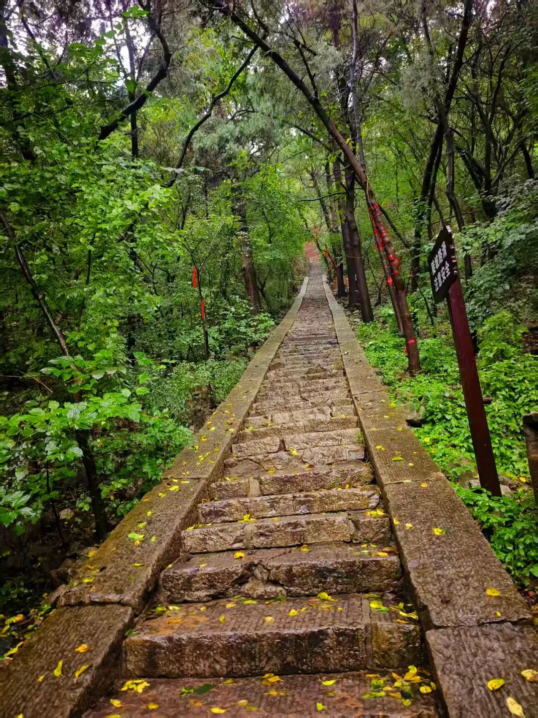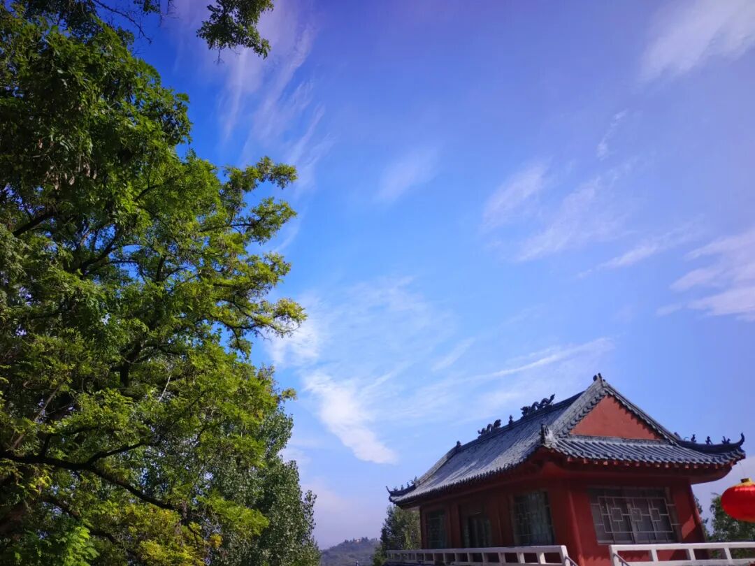 沿石阶往上,雨水润得石板发亮,金黄叶子落了一地,如给山路铺了层碎金。行至高处,天开阔得惊人,蓝得纯粹,云絮像被风吹散的棉絮轻飘着;远处山峦、近处红墙殿宇,都在晴光里浸着清透的静美。