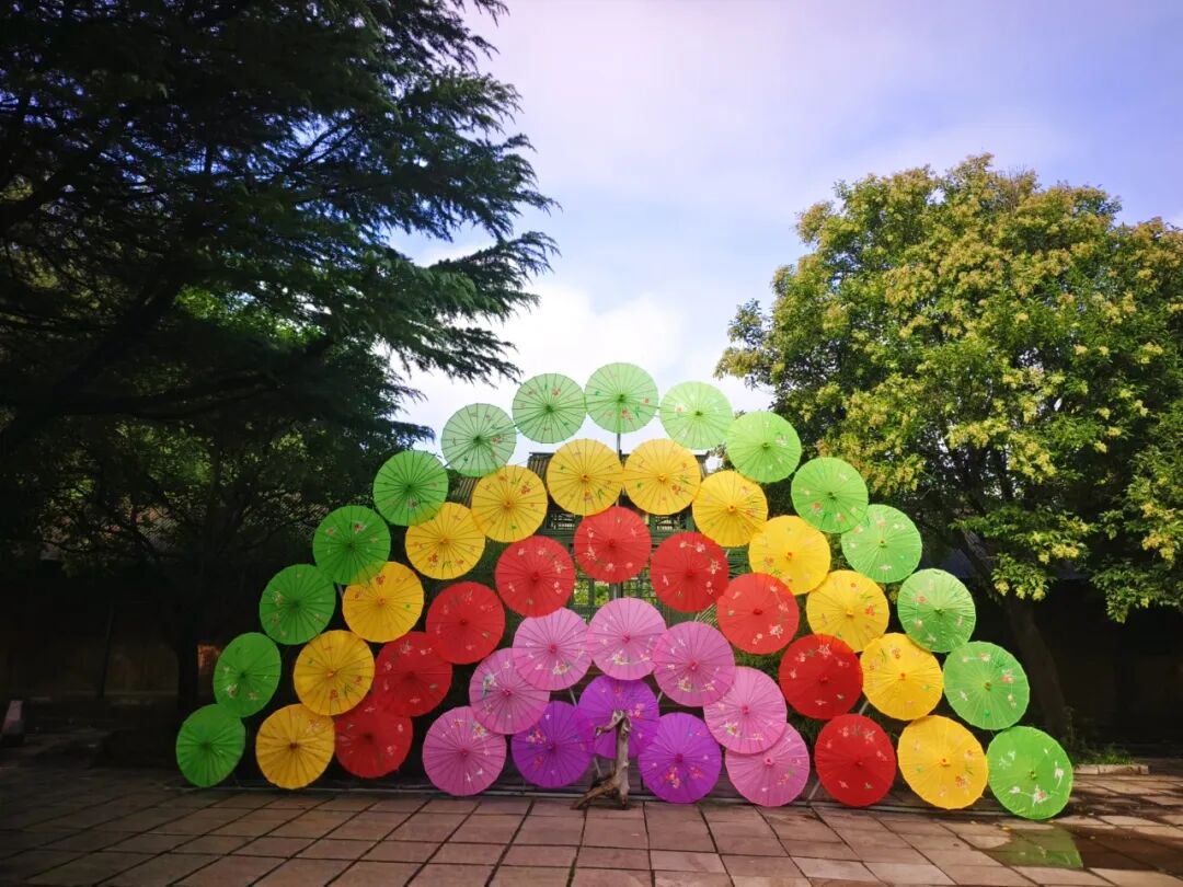 彩色油纸伞簇成虹,沾着雨汽发亮;湖畔亭台静立,池水洇着树影与天光;绿树撑着新翠,衬着白墙黛瓦,连风里都漾着清新的甜。