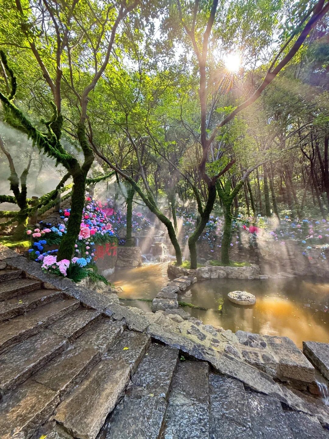 踏入 “绿野仙踪” ,仿若跌进童话秘境。苔藓裹着树干如绿绸垂落,彩花拥着溪流烂漫成画;阳光碎成金缕穿林而来,雾霭在光影里悠悠晃着,连溪水叮咚,都像在替童话述说着秘密。