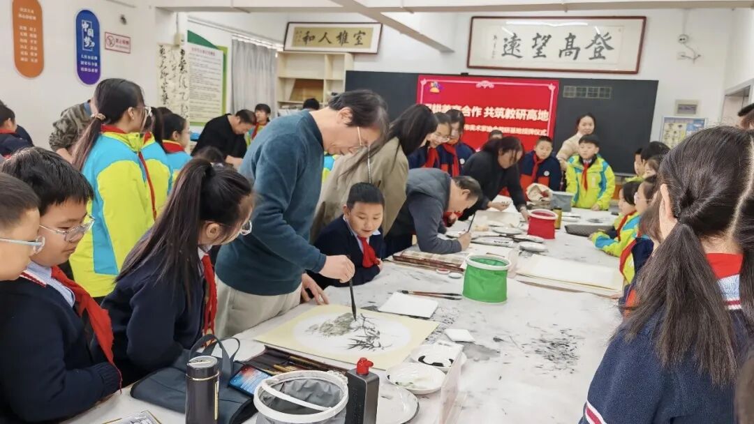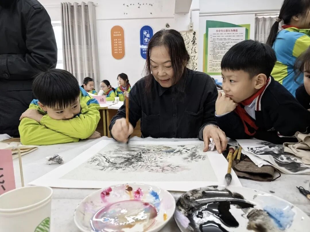随后的艺术交流环节将活动推向高潮。美协艺术家走进美术课堂与活动室,开展面对面示范教学。他们一边讲解构图、用色等基础知识,一边现场挥毫创作,演示中国画笔墨技法,孩子们围在画家身旁,认真聆听、踊跃提问,在互动中感受笔墨丹青的韵味与魅力。
