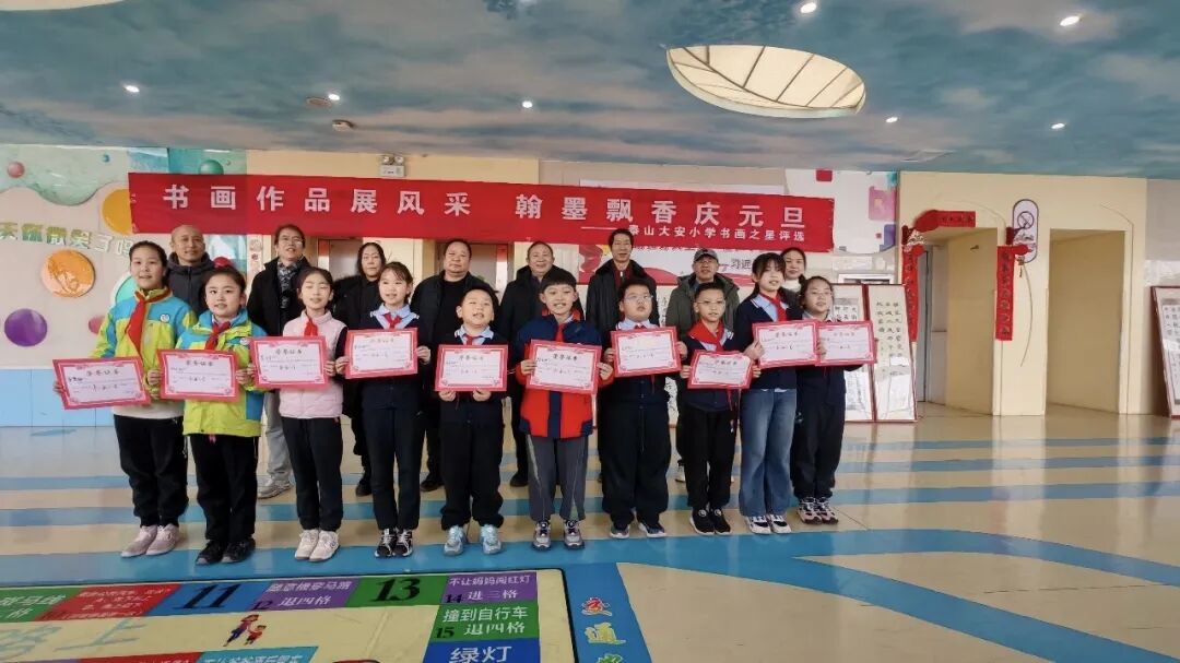 揭牌仪式后,协会艺术家在校方陪同下参观了“翰墨飘香庆元旦”校园书画作品展。展览汇集了全校学生创作的国画、书法、创意画等作品百余幅,题材丰富、充满童趣,展现了孩子们对美好生活的观察与想象。艺术家们对作品的创意与表现力给予高度评价,并为其中三十余名表现出色的“泰山大安小学书画之星”颁发了荣誉证书,鼓励他们持续探索艺术之路。