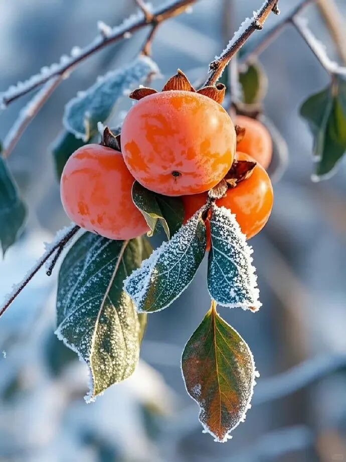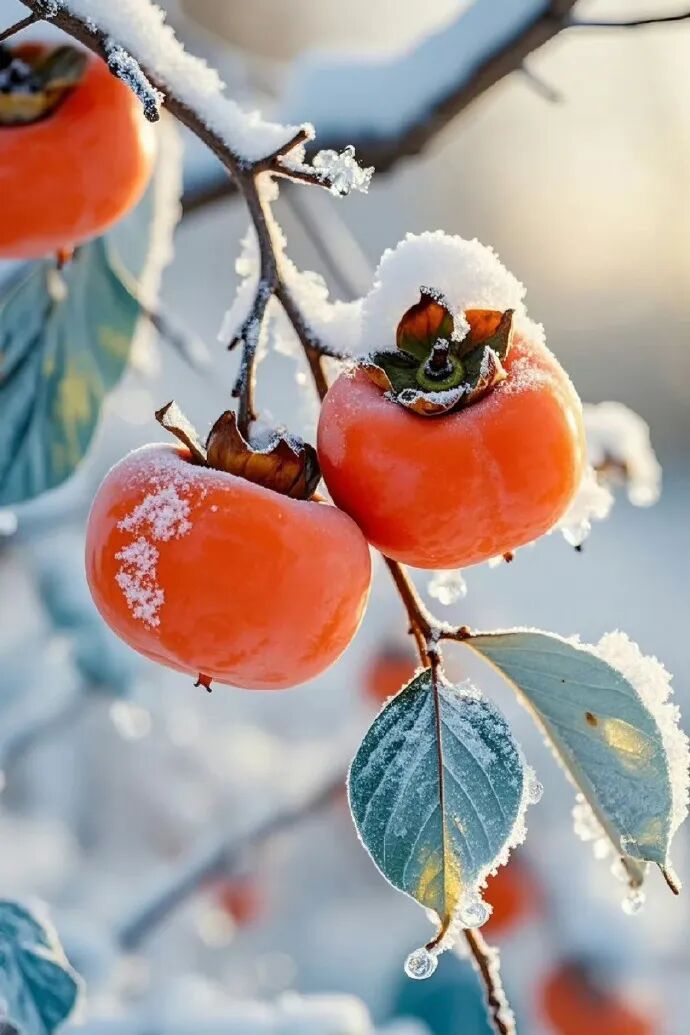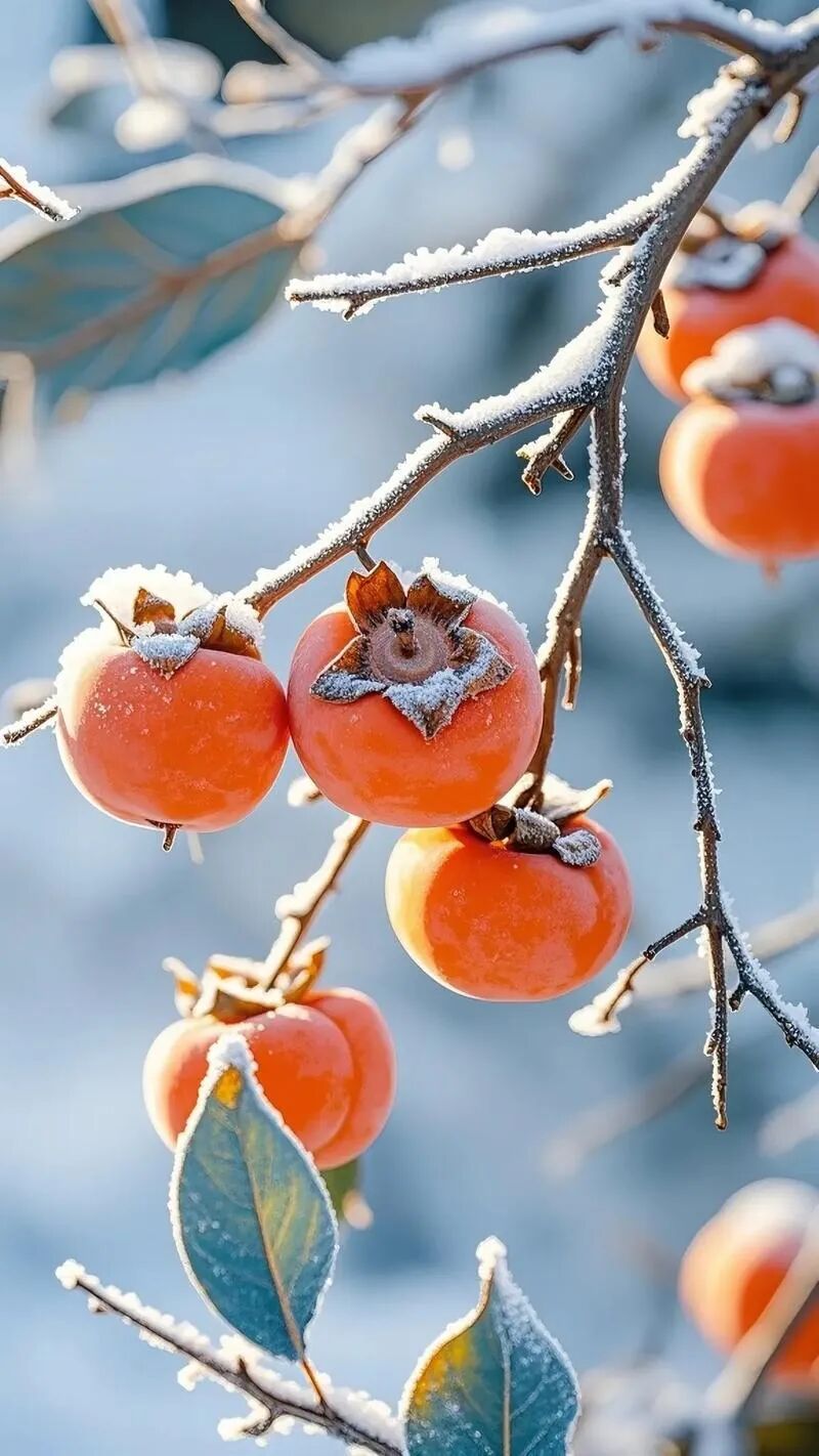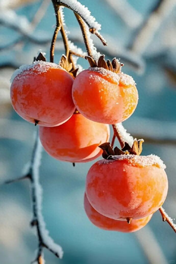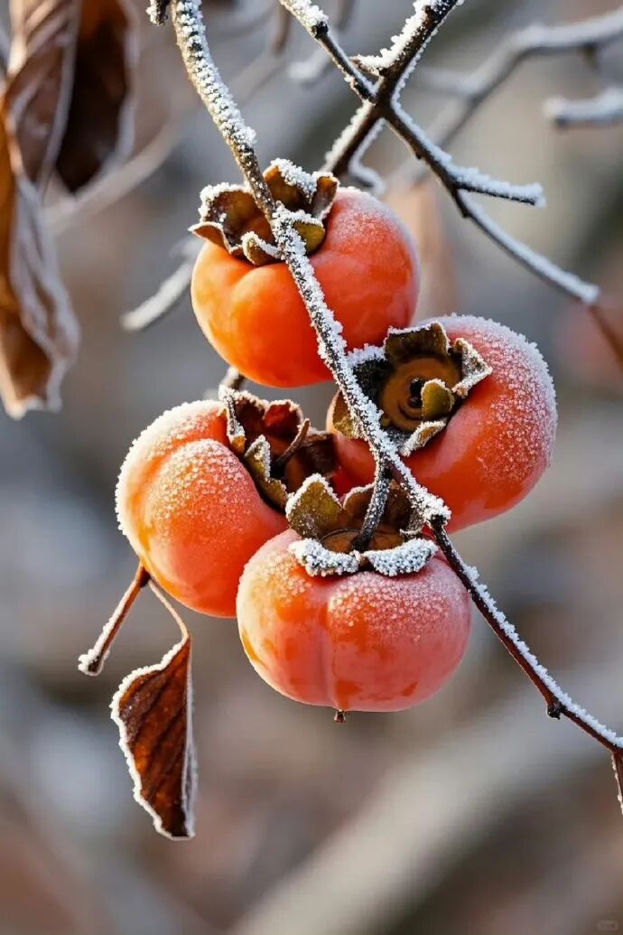 这霜,不是严冬那种刺骨的寒冰,而是糖分悄然析出的结晶,是时光凝结成的柔糯甘甜。它像一位沉默的化妆师,为柿子披上了最后一件,也是最华美的一件衣裳。