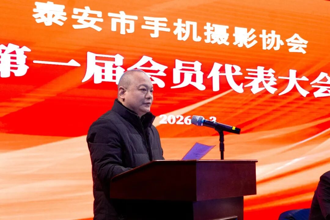 山东省摄影家协会主席范长国在讲话中对协会成立表示热烈祝贺。他指出,手机摄影以其便捷性、普及性成为记录时代、传递心声的重要载体。他对协会发展提出几点要求:一是提高政治站位,坚守意识形态阵地,将社会主义核心价值观融入创作全过程,确保作品兼具思想性与艺术性;二是聚焦时代主题,深入挖掘山东深厚文化内涵与泰安发展变迁,用镜头讲好山东故事、传播泰安形象;三是坚守职业底线,打造一支德艺双馨的摄影队伍。他希望协会成为凝聚摄影人才的桥梁纽带,推动手机摄影艺术水平持续提升。