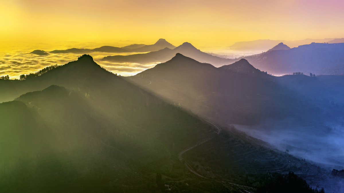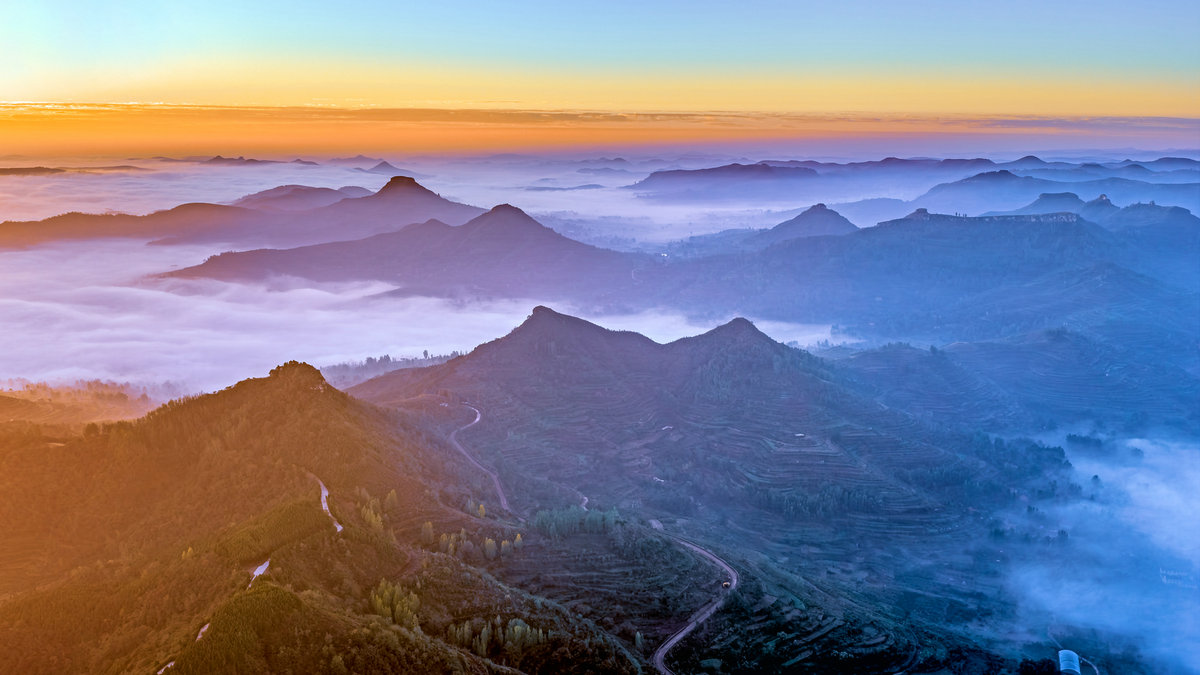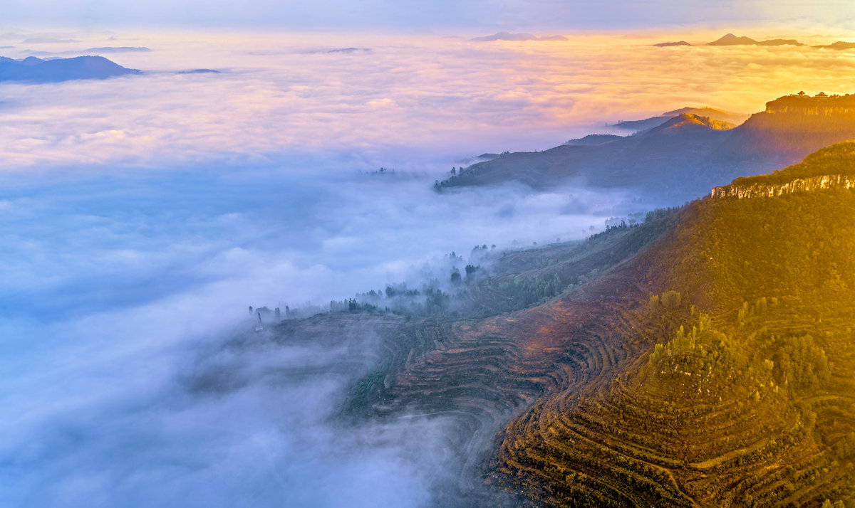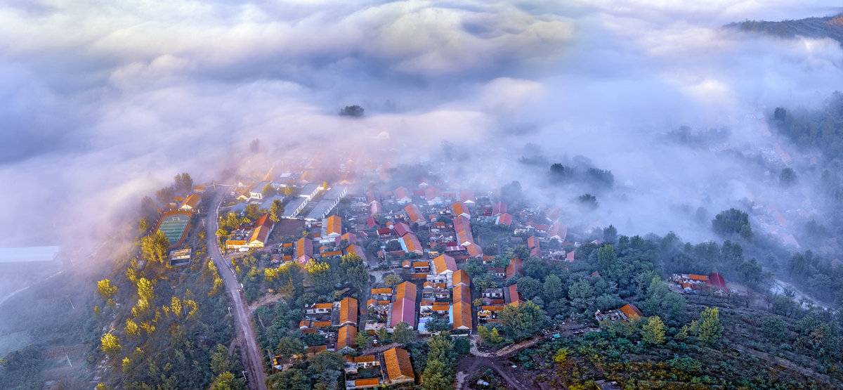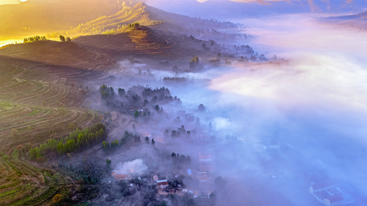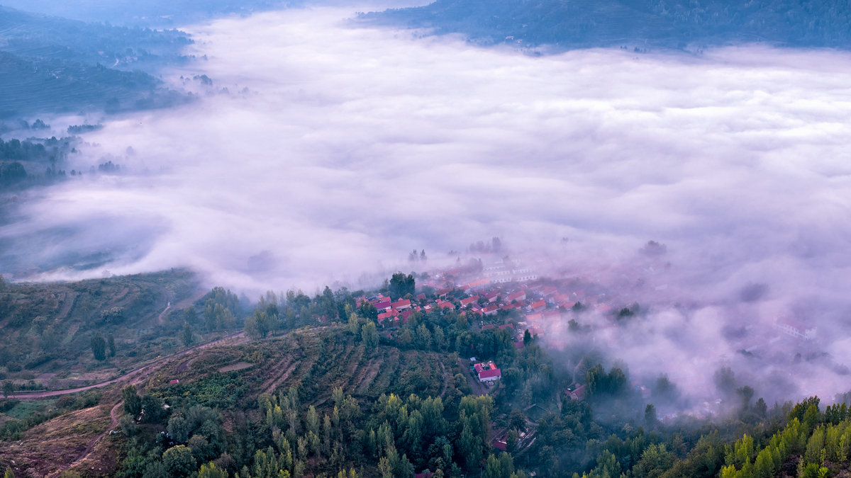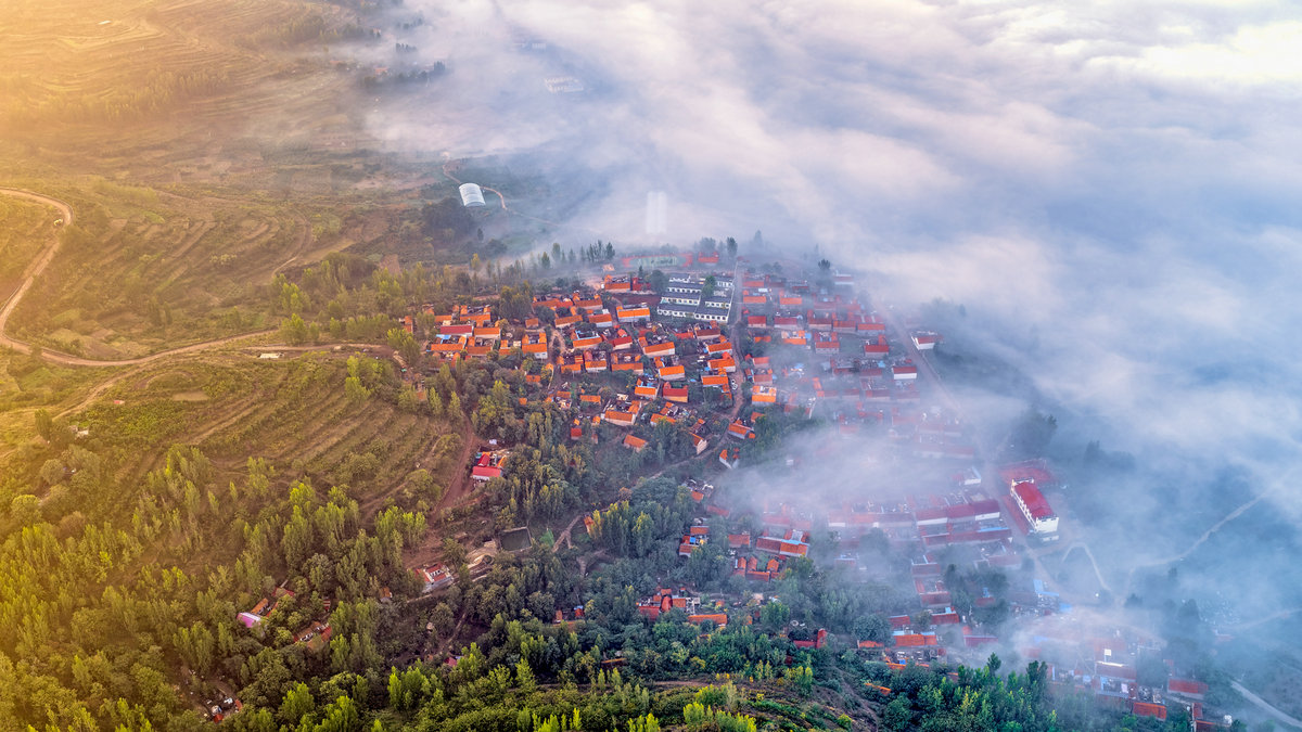 山顶的王城遗址,沐浴在王者般的金光里,诉说着金戈铁马的峥嵘岁月;山下是静谧的烟火人间,村庄在流云中若隐若现,墨色的田埂、淡雅的屋舍轮廓,如同仙境中的水墨画,宁静而安详,展现着亘古不变的田园诗意。这天上与地下,历史与当下,峥嵘与平凡,被一场日出完美地缝合在一起。