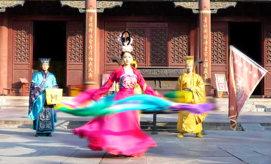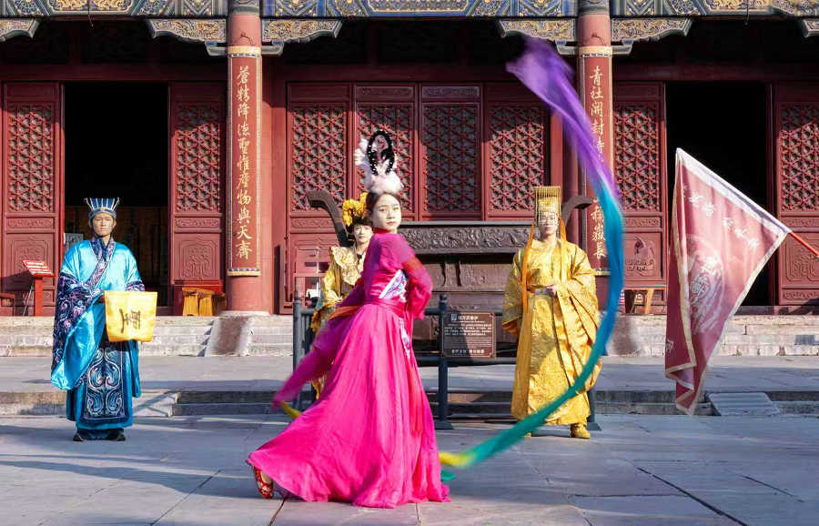 在岱庙核心建筑宋天贶殿前,马来西亚游客观看了由专业演员呈现的盛大演出。演员们身着古代礼服,以庄重的仪轨、恢弘的乐舞,生动再现了古代帝王祭孔、封禅泰山的场景。