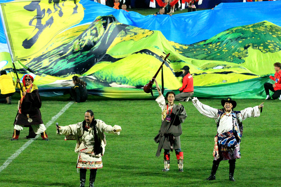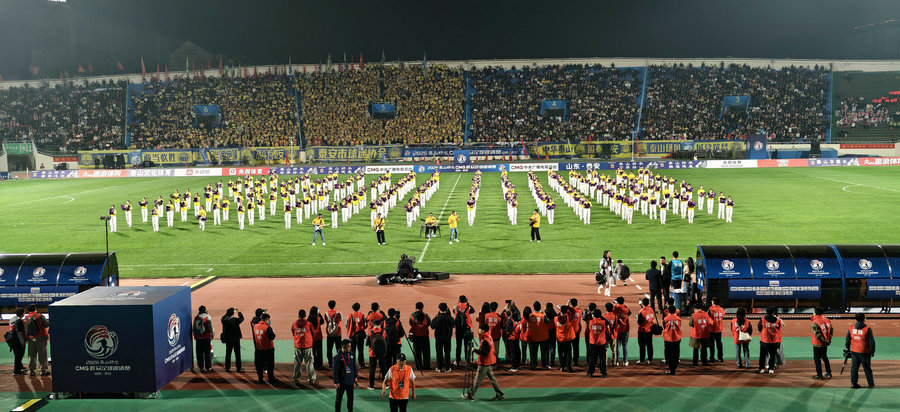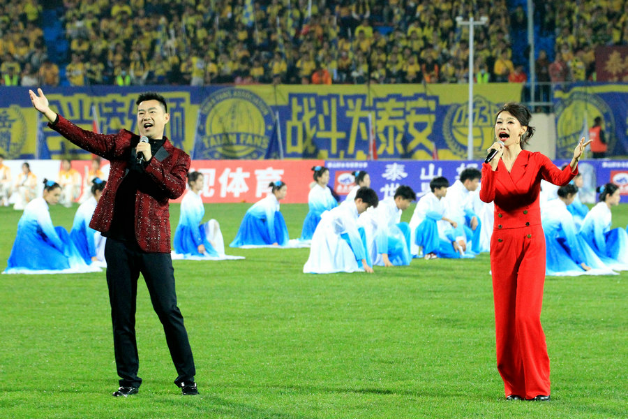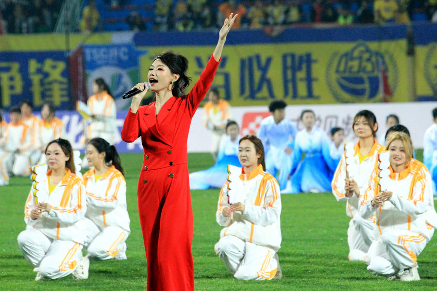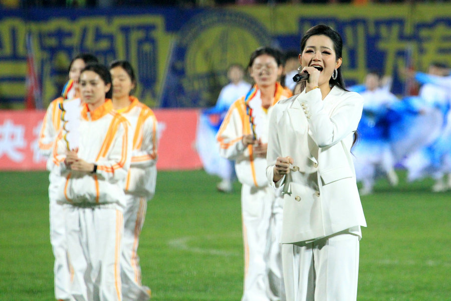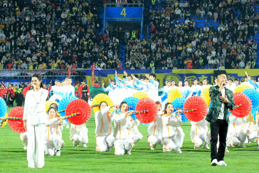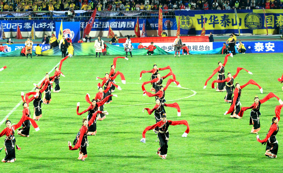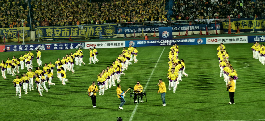 随后,青海玉树的演职人员以绚丽的民族服饰,献上极具高原风情的藏族歌舞《吉祥玉树》,瞬间点燃全场。紧接着,伴随《追梦泰安》的激昂歌声回荡赛场,东道主泰安队的主场氛围升至高潮,揭幕战在万众瞩目中正式打响。