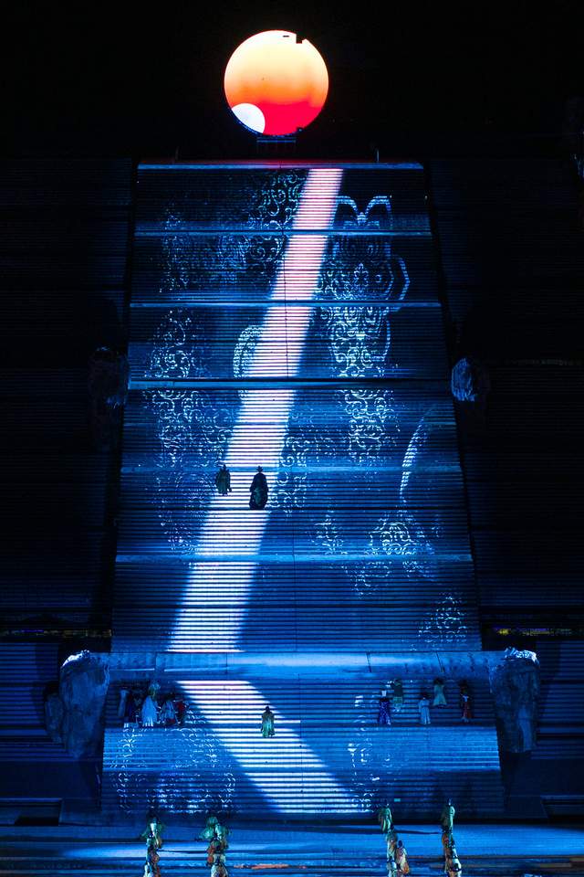 科技与传统的深度交融成为演出的最大亮点。338台数字化灯光设备、6组激光表演器、16台水雾机及68支阵列音响系统,构建全方位的视听矩阵;舞台新增水效区、LED车台屏幕及轨道车、机械马车等22件创意道具,配合声光电的精准调度,为观众营造出“人在画中游”的沉浸式体验。