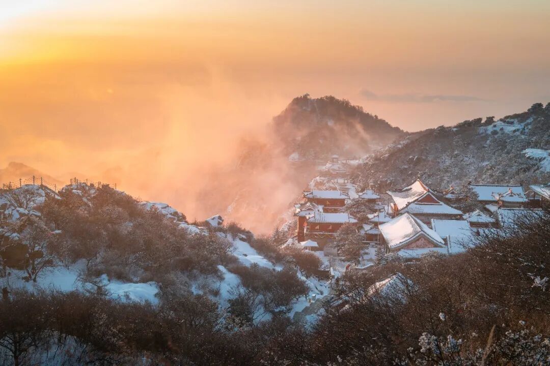 素雪轻覆岱宗峰峦,奇石被琼瑶裹住棱角,苍松虬枝凝作玉簪银树,就连摩崖石刻上的千年笔墨,也被雪痕晕开了温柔。日观峰的朝曦破云而出,金辉淌过覆雪的崖壁,将红墙黛瓦的宫观镀上暖光,朱红与皓白交织,恍若天宫琼楼坠入凡尘。云雾在十八盘的石阶间漫溯,时而绕着南天门的飞檐,时而漫过玉皇顶的亭台,人立崖边,脚下是翻涌的云涛,耳畔是松风与落雪的絮语,一步一景,皆是误入仙源的恍惚。
